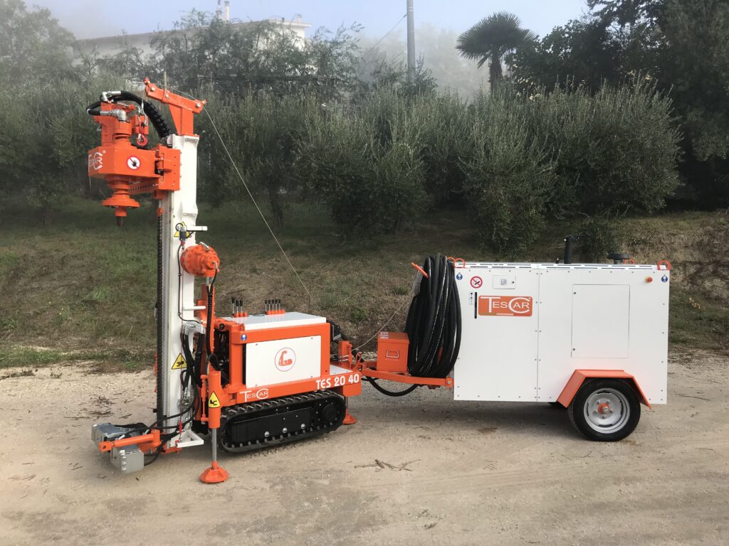 Adecuado para el refuerzo de cimentaciones existentes, los micropilotes para muros de contención pueden trabajar en espacios muy reducidos y, gracias a la unidad de control separada, pueden trabajar dentro de edificios existentes sin problemas de humo o contaminación. Puede equiparse con un motor rotativo de 2,5 ó 5 kNm y está equipado con un motor Tier4 Final. El TES20 puede equiparse con diferentes modos de trabajo: micropilotes, sondeo, perforación de testigos, martillo DTH. El TES20 también está equipado con una bomba de agua de 20 l/min a 60 bar para la purga de muestras de testigos durante las investigaciones sobre el terreno.